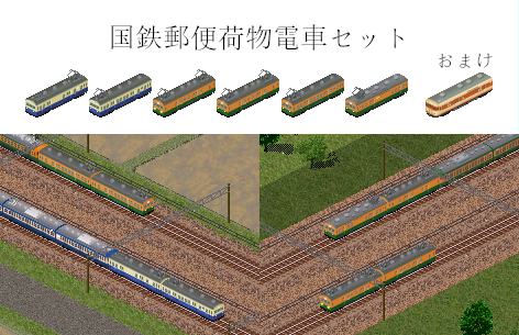 国鉄が運用していた郵便荷物電車のセットです。 小荷物・小口混載・一等旅客と、大ぼけ様製郵便産業を導入済みの方は郵袋も運べます。 クモユニ82、クモユニ74、クモニ83、クモユ141が入っています。 おまけとして大ぼけ様作のキユ25にdat変更とpng修正を加えたアドオンも同封しています。