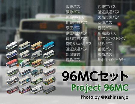 西日本車体工業のバス車体、96MCのセットです。多数実在事業者の塗装のほか、白黒無地やプレイヤーカラーの車体などを収録! なお、こちらのアドオンはProject 96MCメンバーによる分業製作となっております。 【Project 96MC メンバー紹介】 ・M_Kasumi Twitter : @KasumiTrans 担当 : 都営バス/京王バス/京王電鉄…