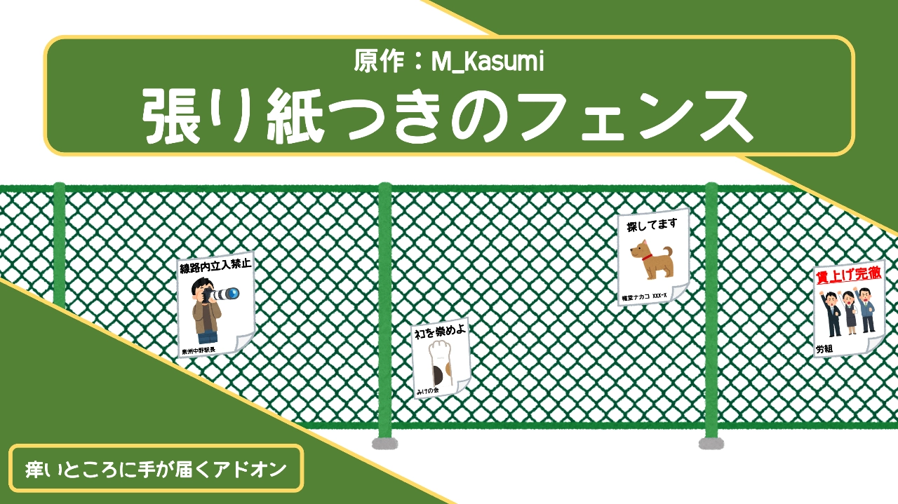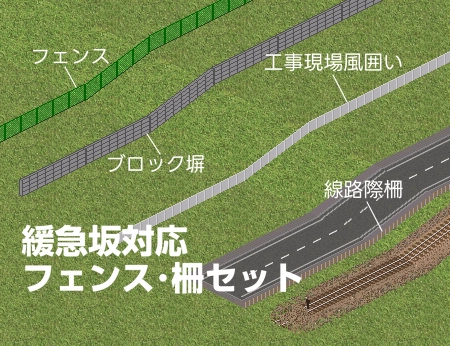 緩急坂に対応したフェンス・柵のセットです。 フェンス・ブロック塀・工事現場風囲い・線路際柵を収録しています。 ※フェンスおよびブロック塀は、MMSomething氏の作品を緩急坂対応改造したものとなります。既に導入済みの方は置き換えることとなりますので十分ご注意ください。