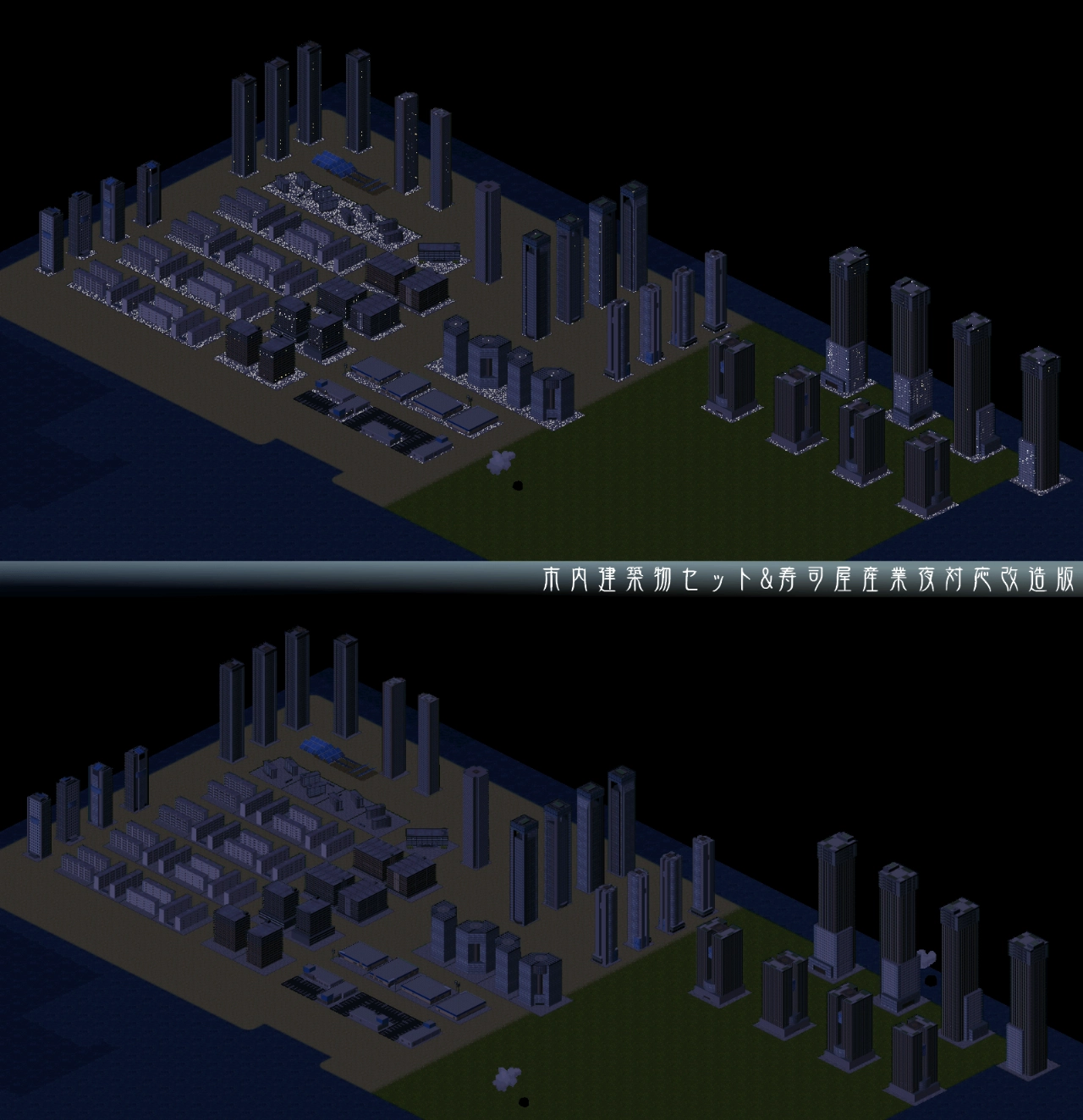 市内建築物セットに収録されている建物を夜対応に改造したものになります。 3Dモデルが元である都合上αチャンネルを使用したアドオンとなっているので、shadesによる一発変換ができないものになっています。 なので、Gimpにある特殊色サーチを使って特殊色をあぶりだし、該当箇所をバケツと手修正したものになります。なの…