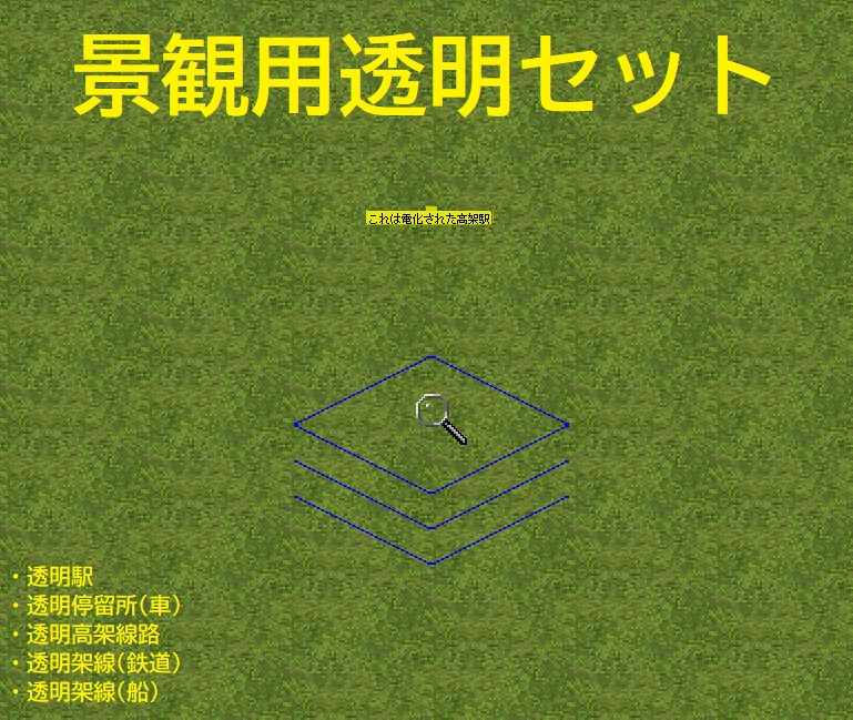 手元環境に存在していなかった透明アドオンのうち、個人的に欲しいと思ったものを制作・pak化しています。 2023.01.14 斜めタイル停留所対応のアドオンを追加 2023.01.28 透明線路・透明道路・透明高架道路追加 2023.03.13 透明リニア軌道・透明高架リニア軌道・透明運河追加