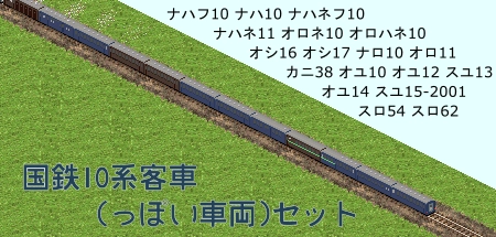 旧国鉄が製造した軽量客車、10系客車(とオマケでスロ54とスロ62)を作成しました。 『とりあえず10系っぽい見た目をしていて10系の性能で走ればいい』という精神でつくったため、所々実車と違う点があります。 また、重量等のスペックもネットの海から拾い集めた情報を参考にしているので実際とは違う可能性があります。 …