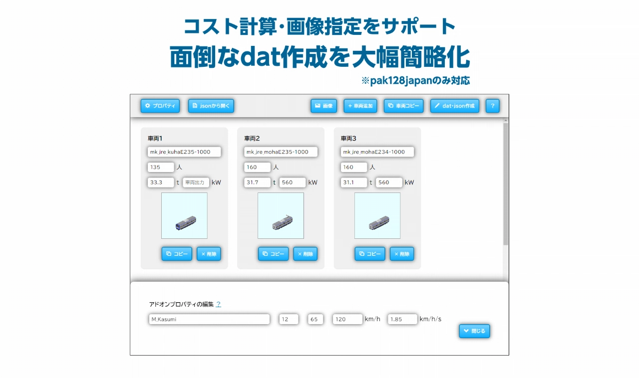アドオン制作で避けては通れず面倒なのが、「datファイル」の制作。 そんなdat制作の、画像指定とコストの計算を半自動化したWebアプリケーションを作りました! 画像やスペックなどの情報を入力すると、pak128jaanの公式コストシートに基づいた計算式からコストを算出し、datファイルの書き出しまでを行います。 Windo…