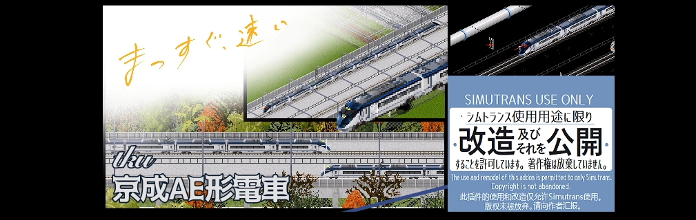 京成電鉄のスカイライナーとして使用されるAE形電車を作成しました。 なおSimutransのゲーム上における都市間特急としての要求性能を満たすために 定員増のほか200km/hに対応した仕様になっております。 他細かい仕様などは省略しておりますので予めご了承ください。