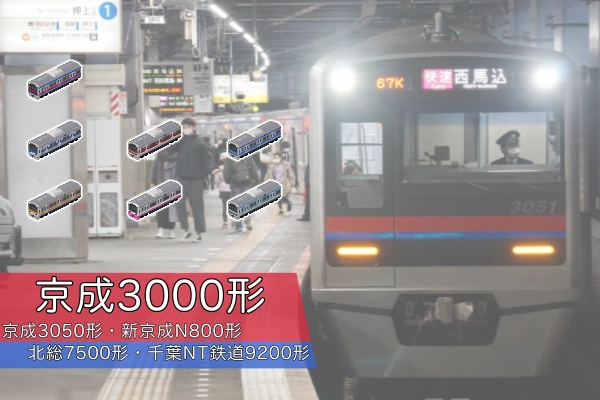 京成電鉄の主力車両・3000形のアドオンです。共通設計(京成グループ標準車体)の新京成N800形・北総7500形・千葉ニュータウン鉄道9200形も収録しています。