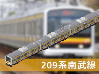 E233系投入まで南武線最新車だった209系です。 90年代に直接投入された0番台(アドオンでは菱形パンタ・方向幕)と2009年以降京浜東北線から転入してきた2200番台(アドオンではシングルアームパンタ・LED行先表示器)の両方が入っています。 サムネイル画像はWikipediaよりお借りしました。