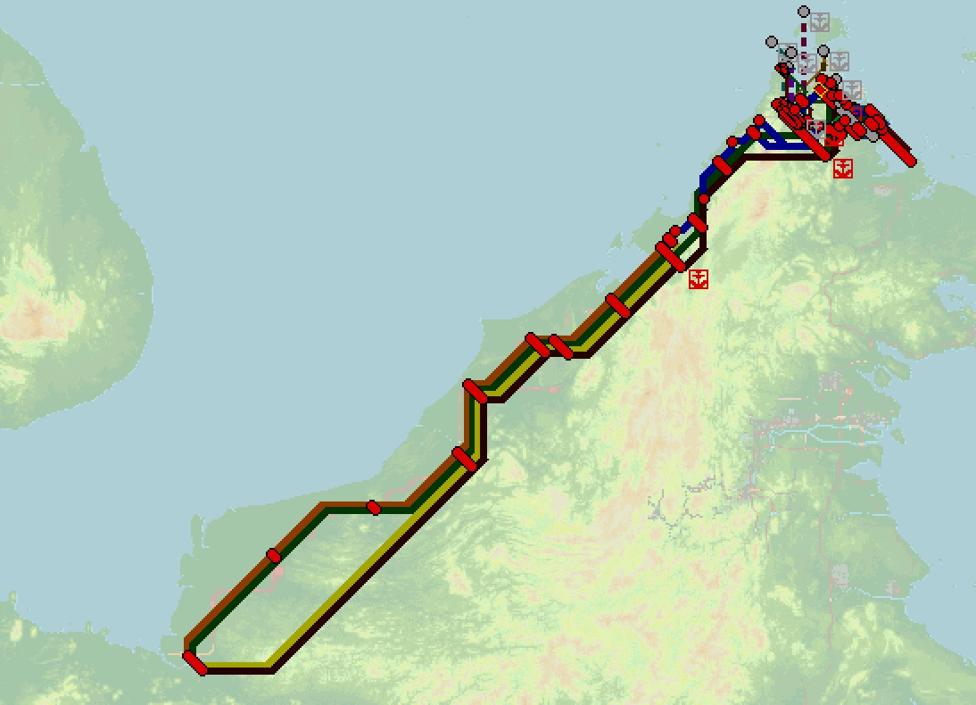 JRポジションの路線は、主に北海道(札幌近郊)を元ネタに敷設しています。ですがそれだと面白みがなく、かつ田舎区間が人口密度が極めて低い地域になってしまいます。そのため、函館本線札幌ー旭川間を元ネタにした路線に紀勢本線紀伊田辺ー新宮を元ネタにした路線を繋ぐことで人口密度を保ちました。