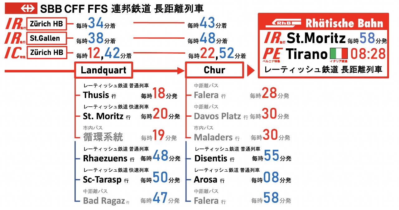 と、ここまでなら欧州の他の国でもよくあることです。スイスのダイヤが特徴的なのは、国鉄(連邦鉄道)だけではなくその他の交通機関の発着時間まで揃えていることにあります。以下、例としてクール(Chur)近郊の例を示します。 スイス国鉄列車からレーティッシュ鉄道・バスへ、いずれも10~15分以下の短い乗り継ぎ時間で乗り継げることがわかります。