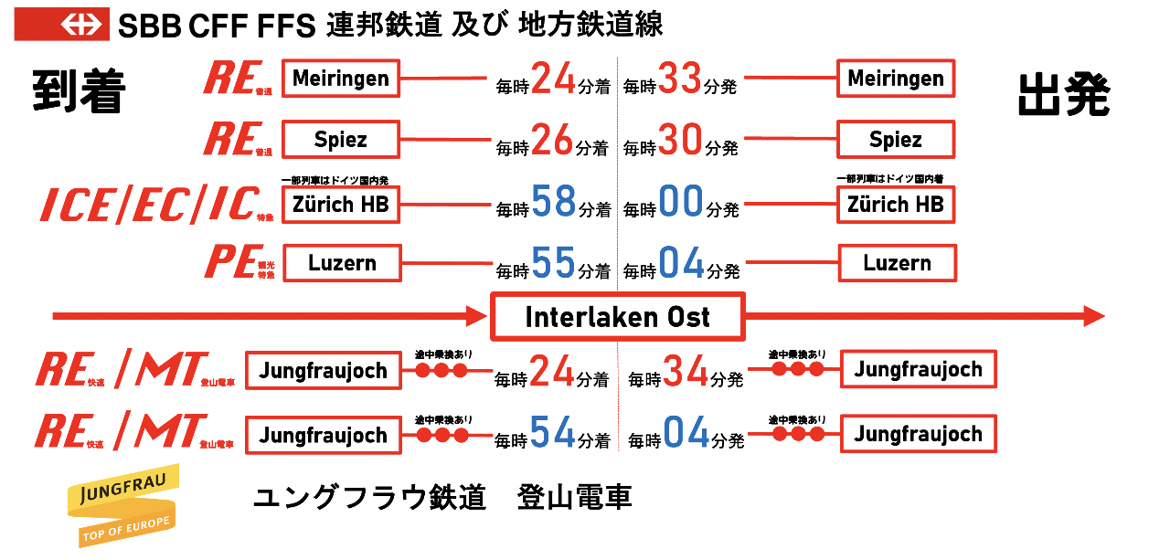 スイス国鉄は1982年にパターンダイヤを導入しました。これは各系統で列車の毎時の発着時間を統一するもので、以下のInterlaken Ost駅のように時刻表が明快となり、乗り換えも便利になって乗客の利便性が向上し......